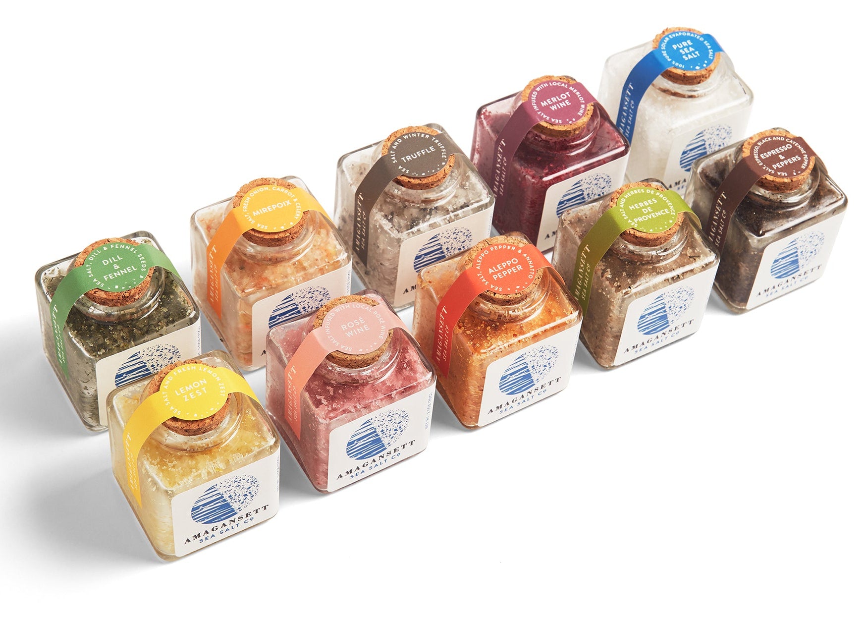 Individual jars of pure sea salt and naturally flavored and infused sea salt blends made by us by hand from clean Atlantic Ocean seawater, solar evaporated outdoors in the clean air, of the Hamptons